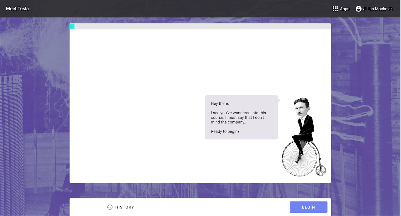 Tesla introduces the learner to some of his "friends" (semi-fictitious characters) who challenge the learners thinking via feedback and conversation.